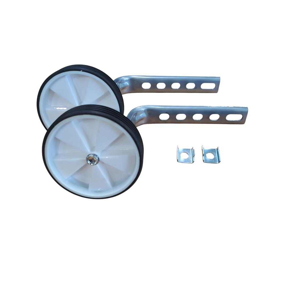 Kółka podporowe do rowerków dziecięcych z metalowymi wspornikami i metalowymi kółkami ze wszystkimi rodzajami regulacji, które umożliwiają dopasowanie do rowerków na kołach od 12" do 20".